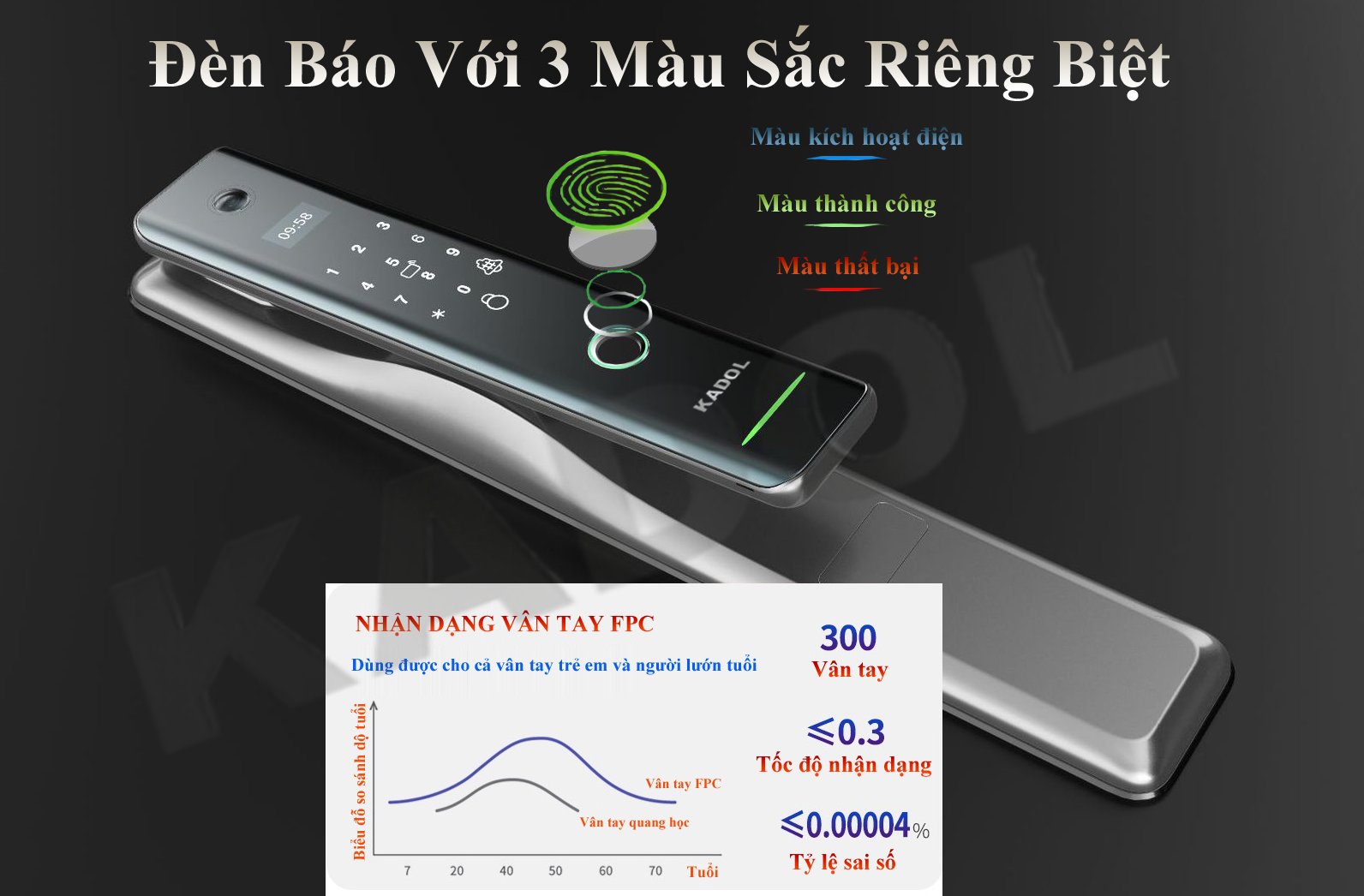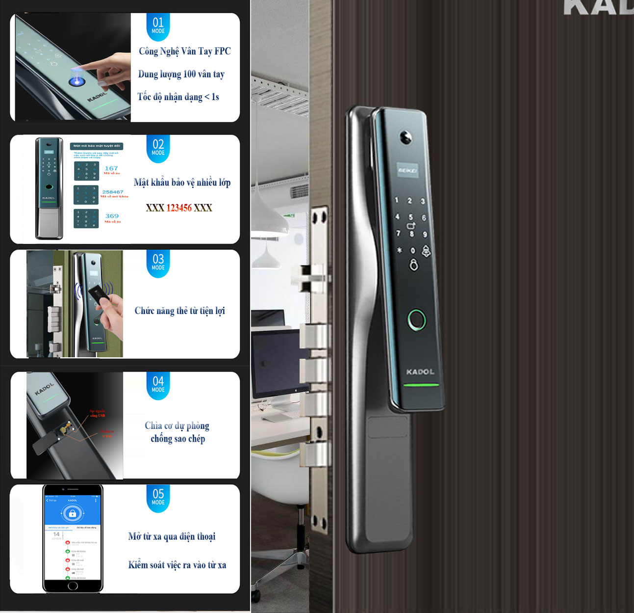 Khóa thông minh Kadol K789 sử dụng vân tay, mã số, thẻ từ, chìa cơ,mở rộng mở từ xa bằng điện thoại qua wife và 4G thông qua App để mở cửa rất tiện lợi đi kèm với tính bảo mật cực kì cao.